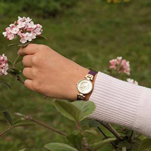 Watch size selection guide. This lovely Anne Klein watch exudes a classic and beauty that will never tire on your wrist. Gold metal case. Brown leather strap with adjustable buckle. Round dial. Quartz movement, three-hand analog display. The champagne dial features gold hour markers and hands, black minute track and Anne Klein detailing. Waterproof to 30 meters / 100 feet. import. Dimensions: Case Height: 26mm, Case Width: 26mm, Case Depth: 8mm, Strap Width: 12 7⁄10mm, Strap Circumference/Length: 8 1⁄2" Weight: 1 oz.