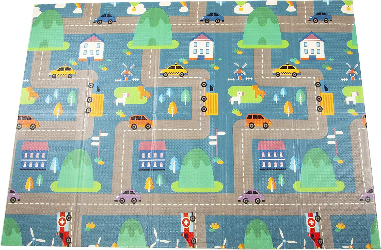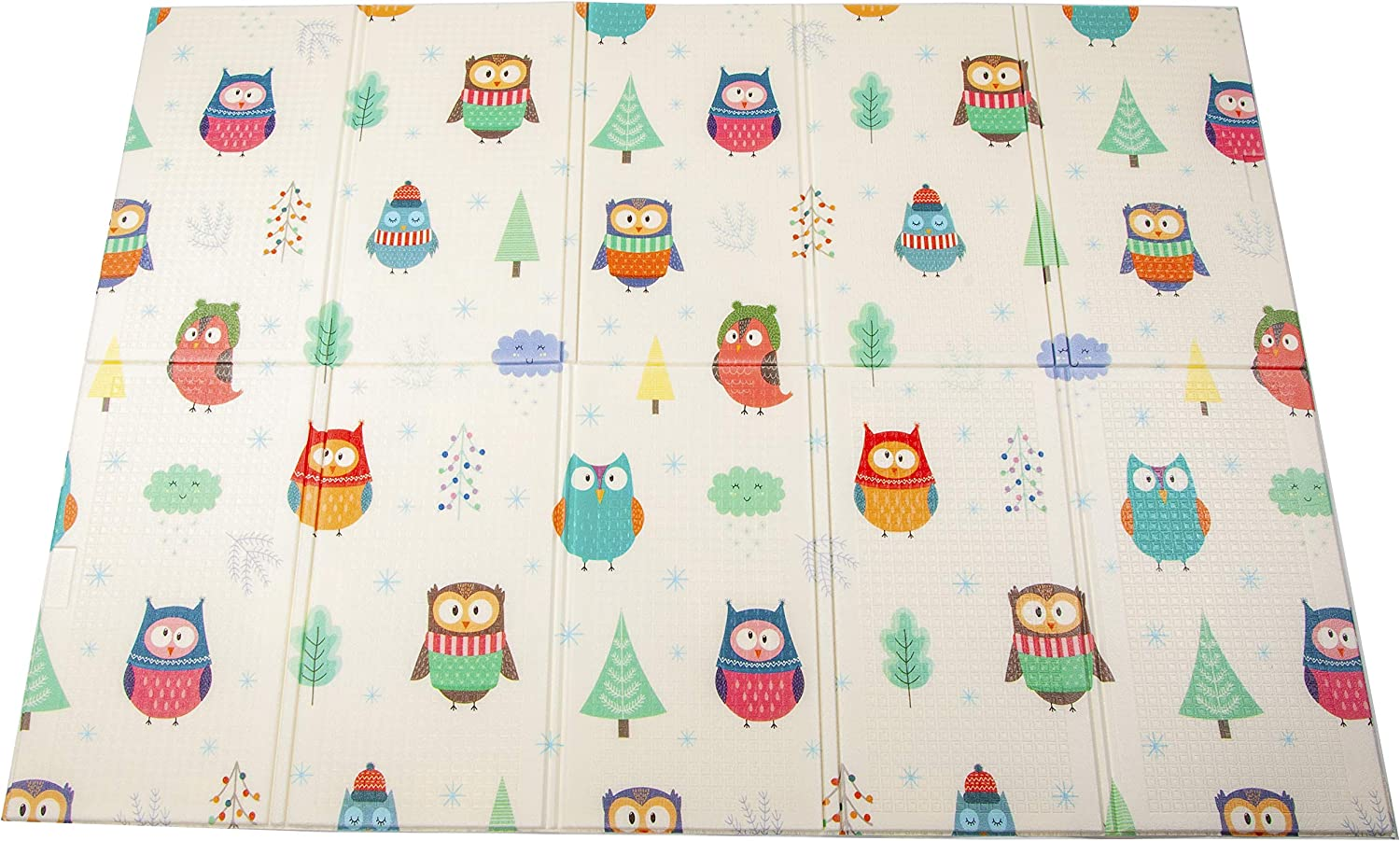 - Double-sided design. Comes with two versions: Animals+Letters and Owls+Cities. Bright color and teaches basic recognition. Full dimensions: 58-inch x 77-inch, 0. 33-inch thick. Folding dimensions: 15. 4-inch x 28. 9-inch, 3. 74-inch thick