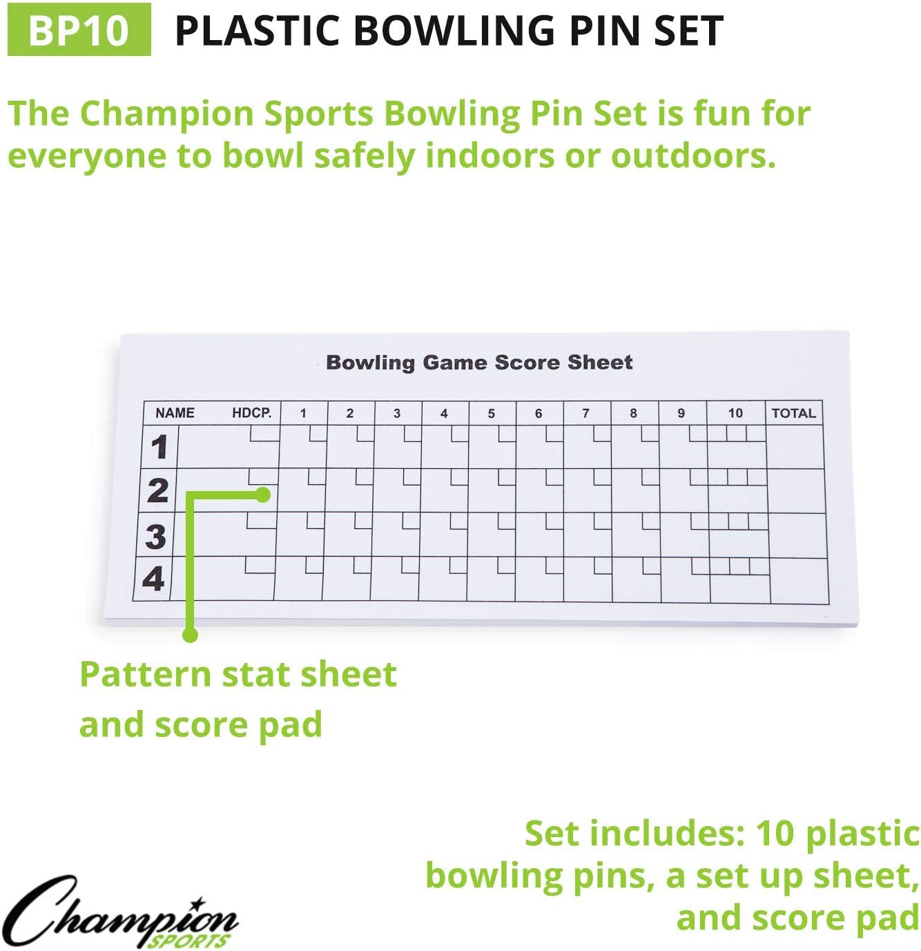- 10 PIN BOWLING - Champion Sports Plastic Bowling Pin set features ten white pins, the number used by the pros; buy bowling pins and balls for school physical education classes or the recreation room
